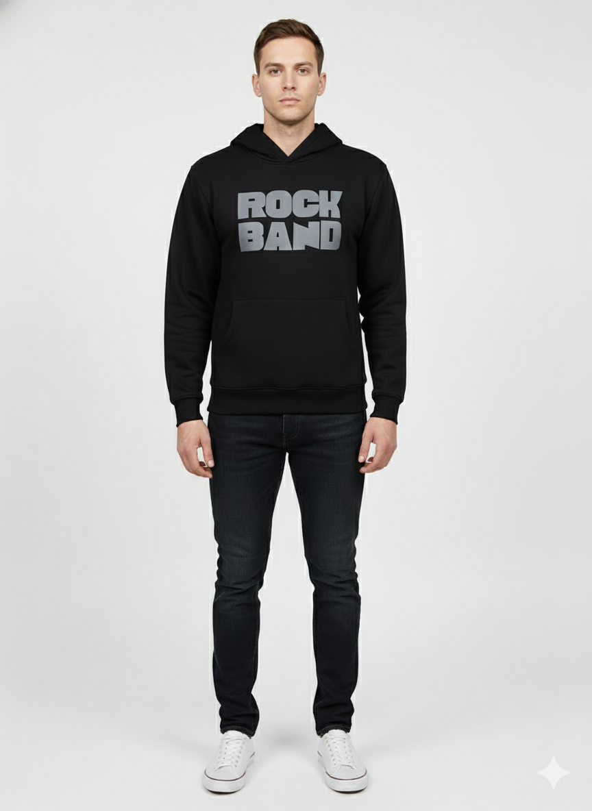 Men's Retro Bold 'ROCK BAND' Back Graphic Hoodie - Polar Jet Black